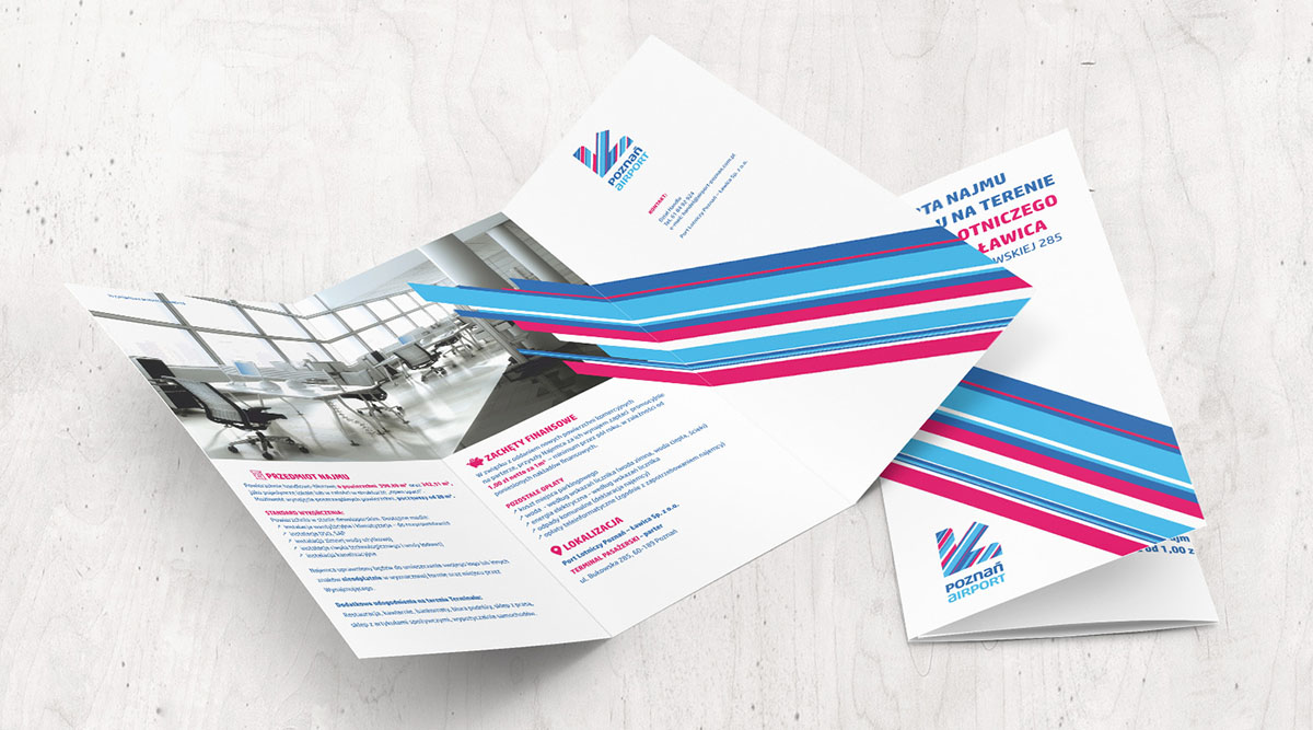 Udana realizacja broszury prezentującej strefę BEL i VIP dla Portu Lotniczego Ławica zaowocowała kolejnym zleceniem. Tym razem miałem przygotować ulotkę informującą o możliwości wynajęcia powierzchni biurowo-usługowych na terenie Portu. Projekt wykonałem zgodnie z estetyką pozostałych materiałów reklamowych.